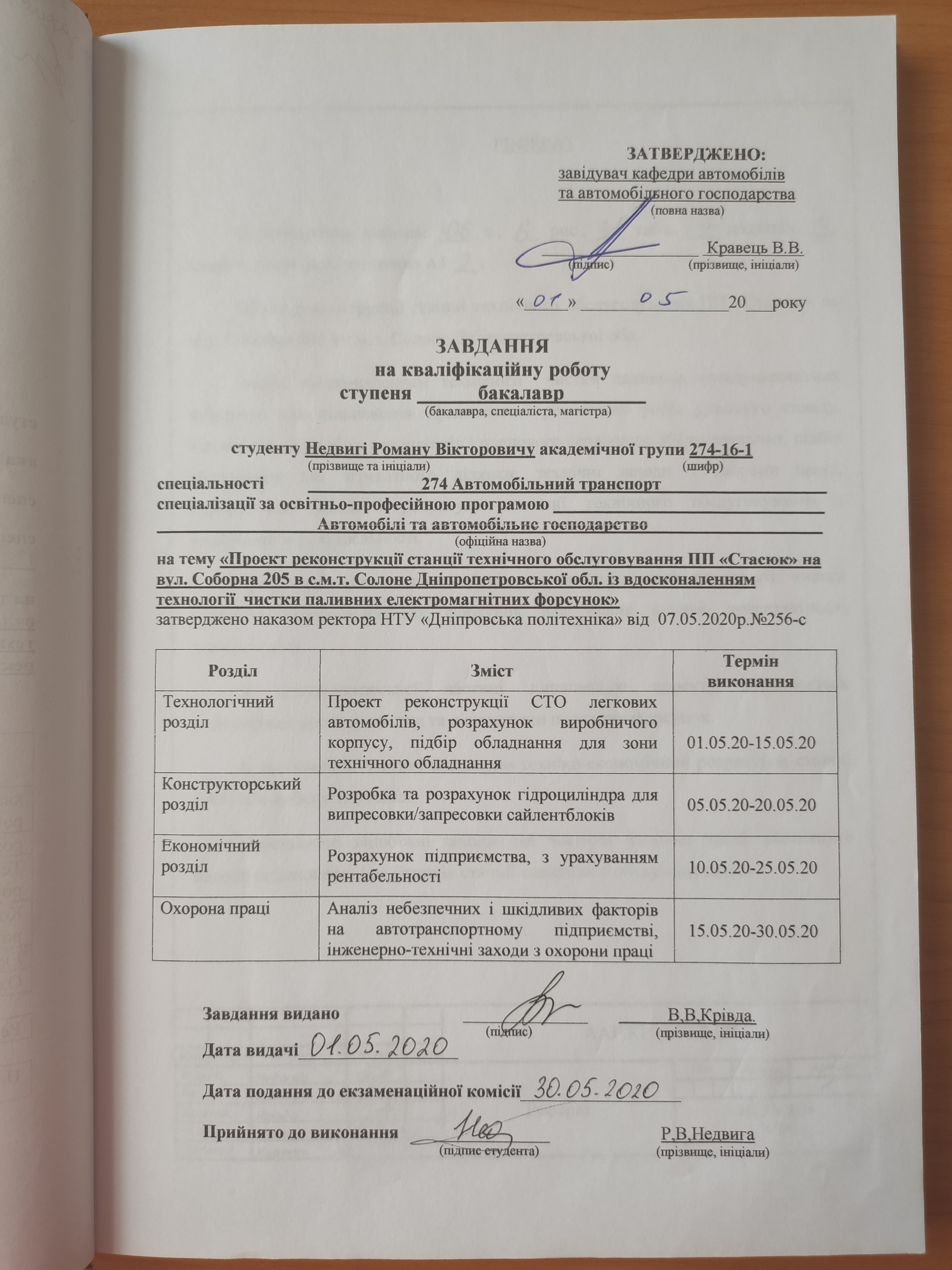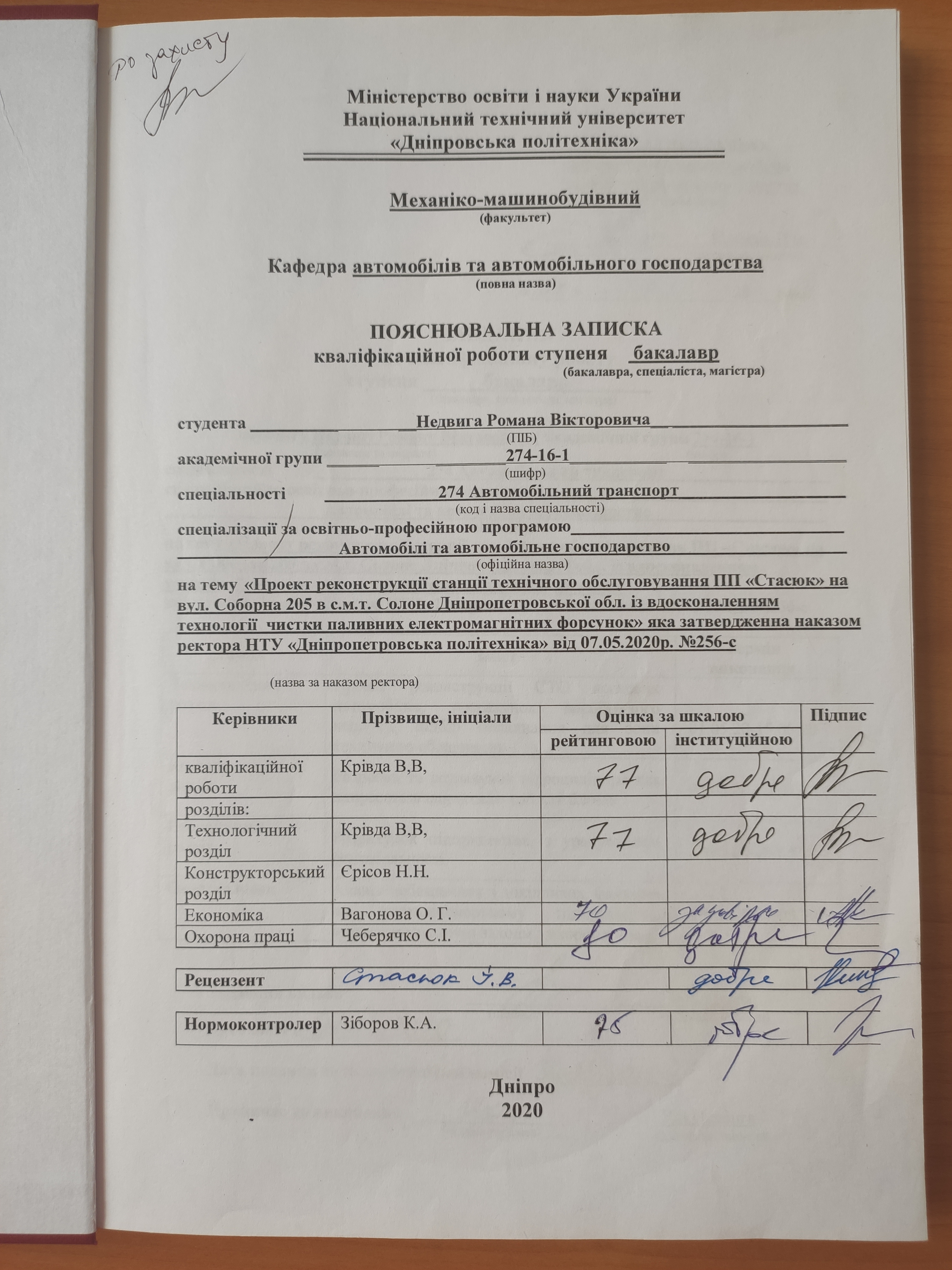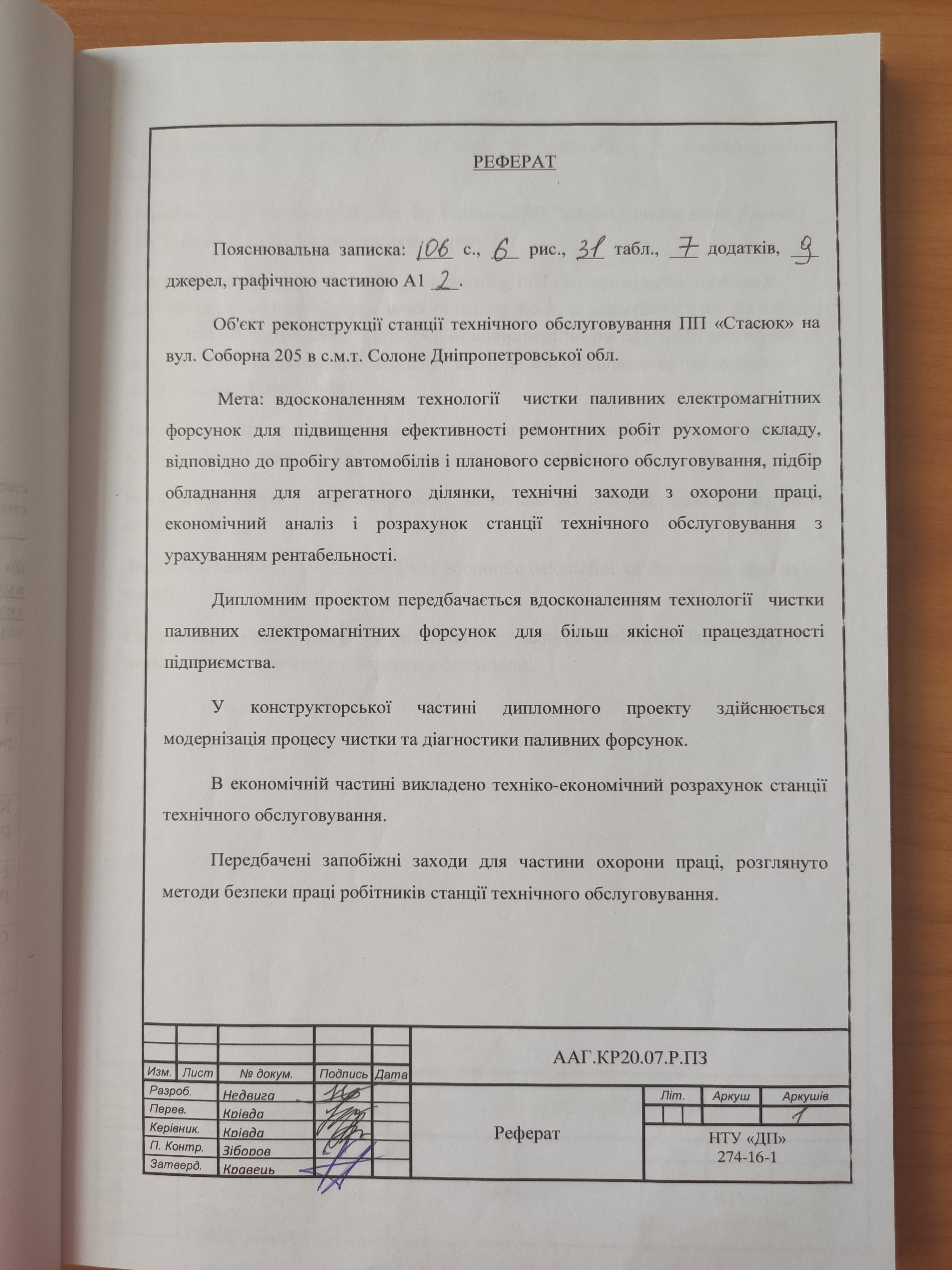 Реконструкція станції технічного обслуговування ПП «Стасюк» на вул. Соборна 205 в с.м.т. Солоне Дніпропетровської обл. з вдосконаленням технології чистки паливних електромагнітних форсунок для підвищення ефективності ремонтних робіт рухомого складу, відповідно до пробігу автомобілів і планового сервісного обслуговування, підбір обладнання для агрегатного ділянки, технічні заходи з охорони праці, економічний аналіз і розрахунок станції технічного обслуговування з урахуванням рентабельності.