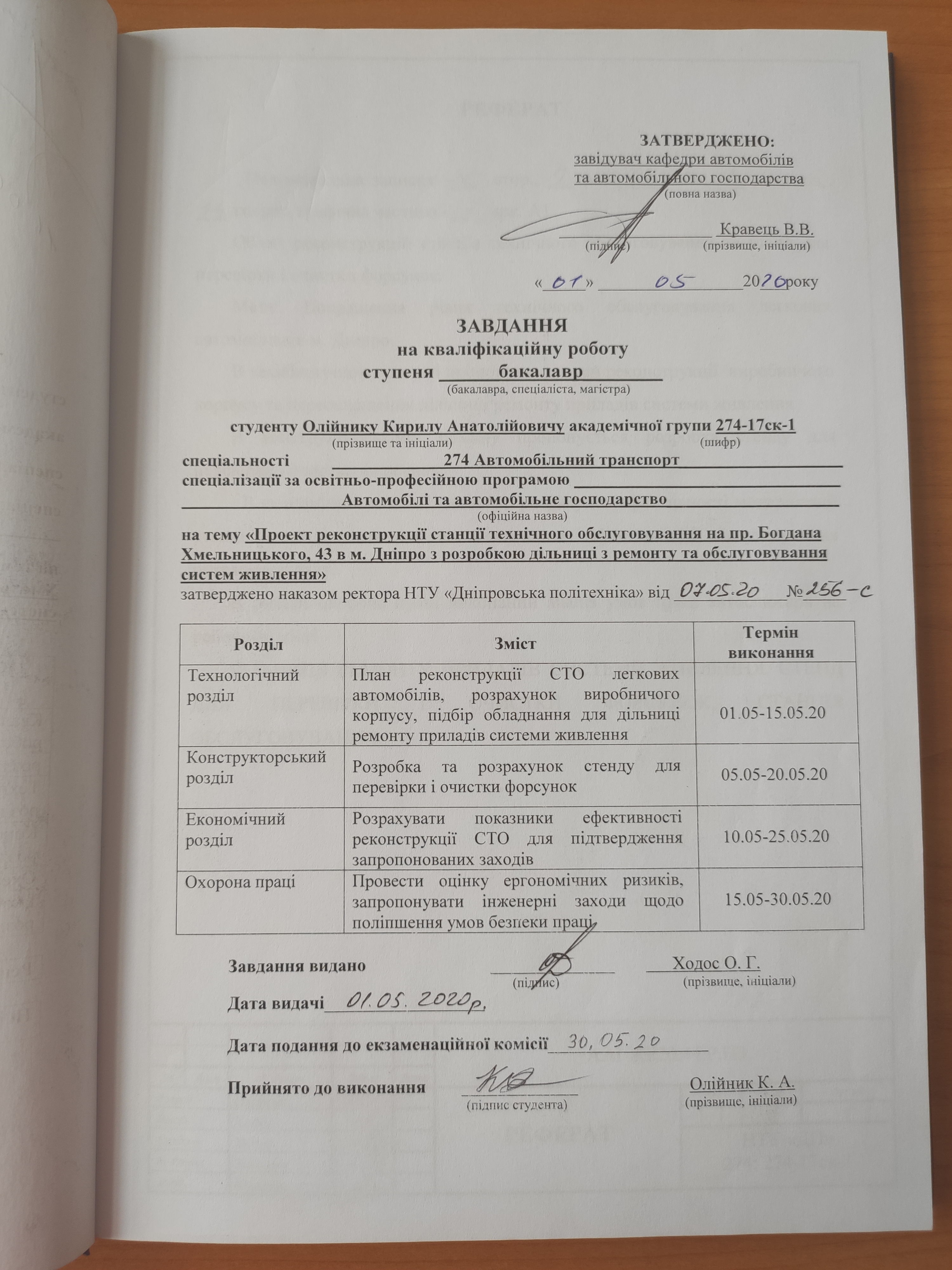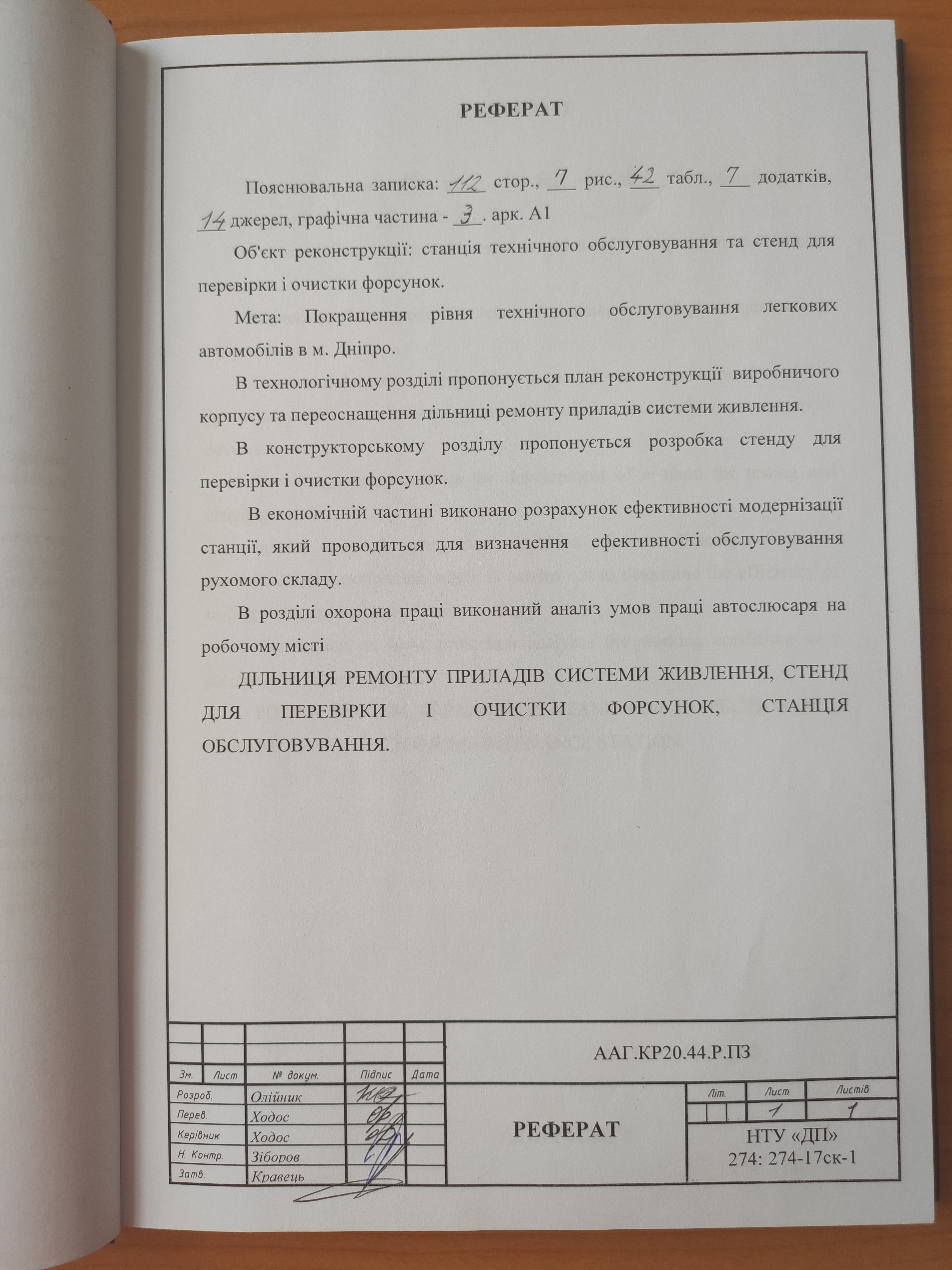 Проект реконструкції станції технічного обслуговування на пр. Богдана Хмельницького, 43 в м. Дніпро з розробкою дільниці з ремонту та обслуговування систем живлення