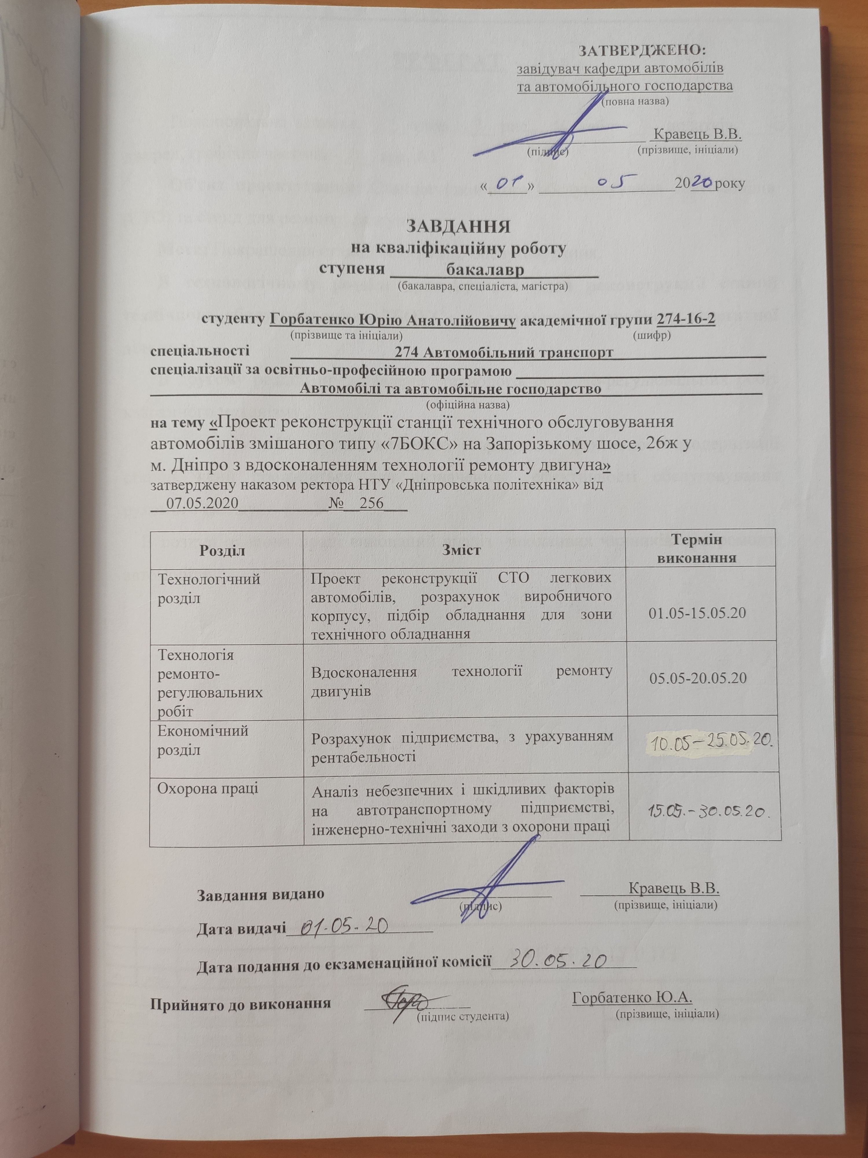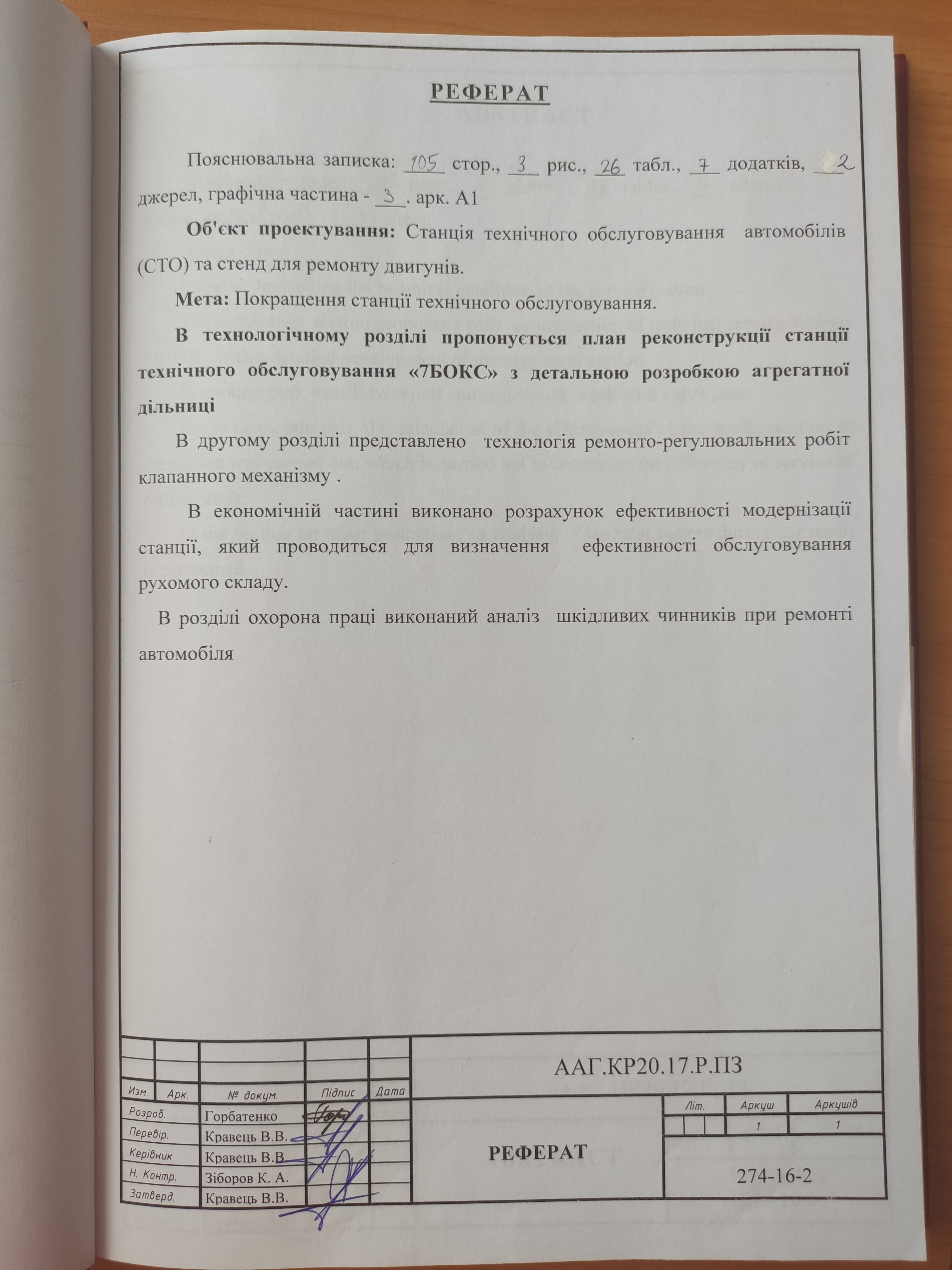 Проект реконструкції станції технічного обслуговування автомобілів змішаного типу «7БОКС» на Запорізькому шосе, 26ж у м. Дніпро з вдосконаленням технології ремонту двигуна