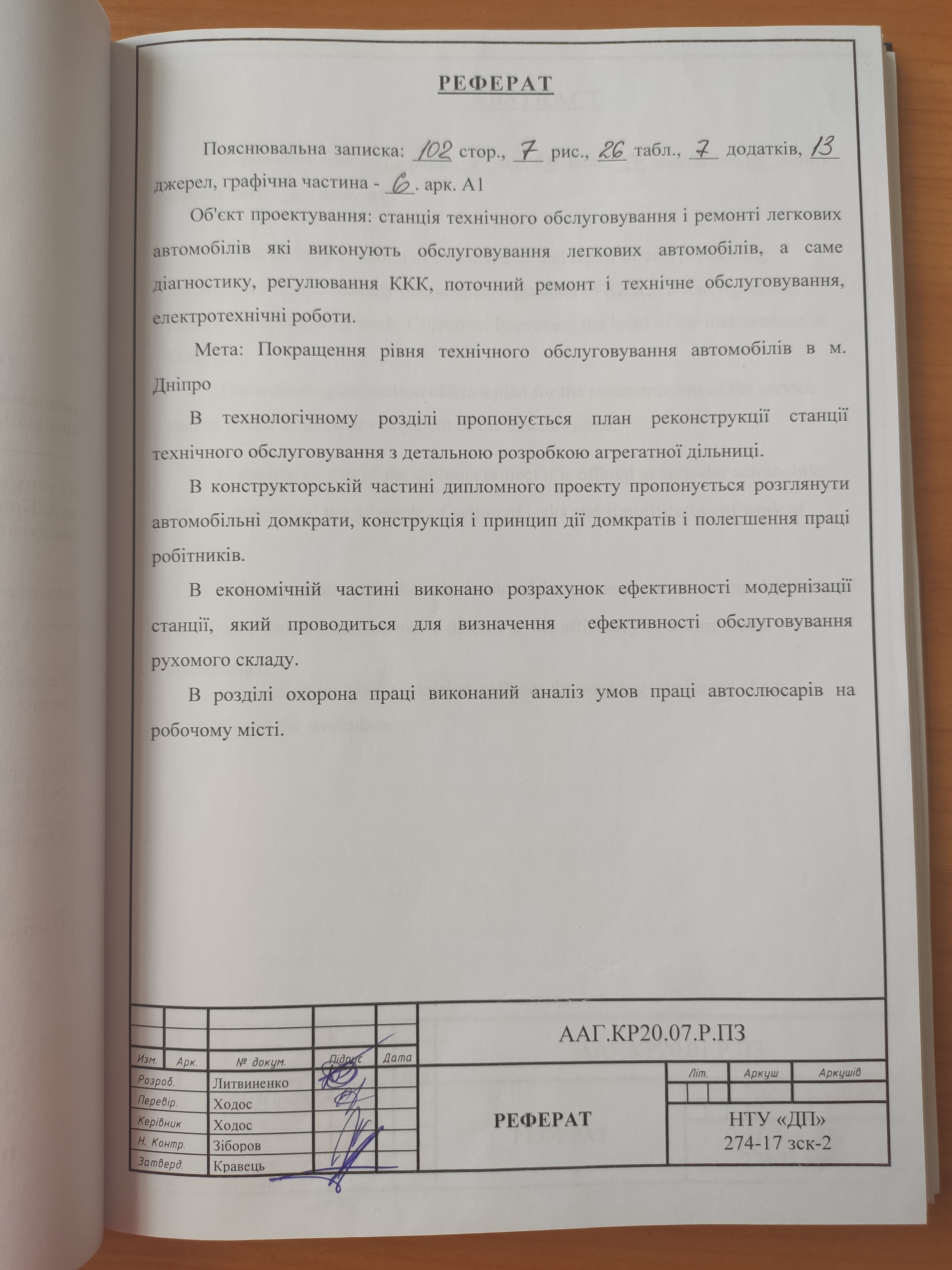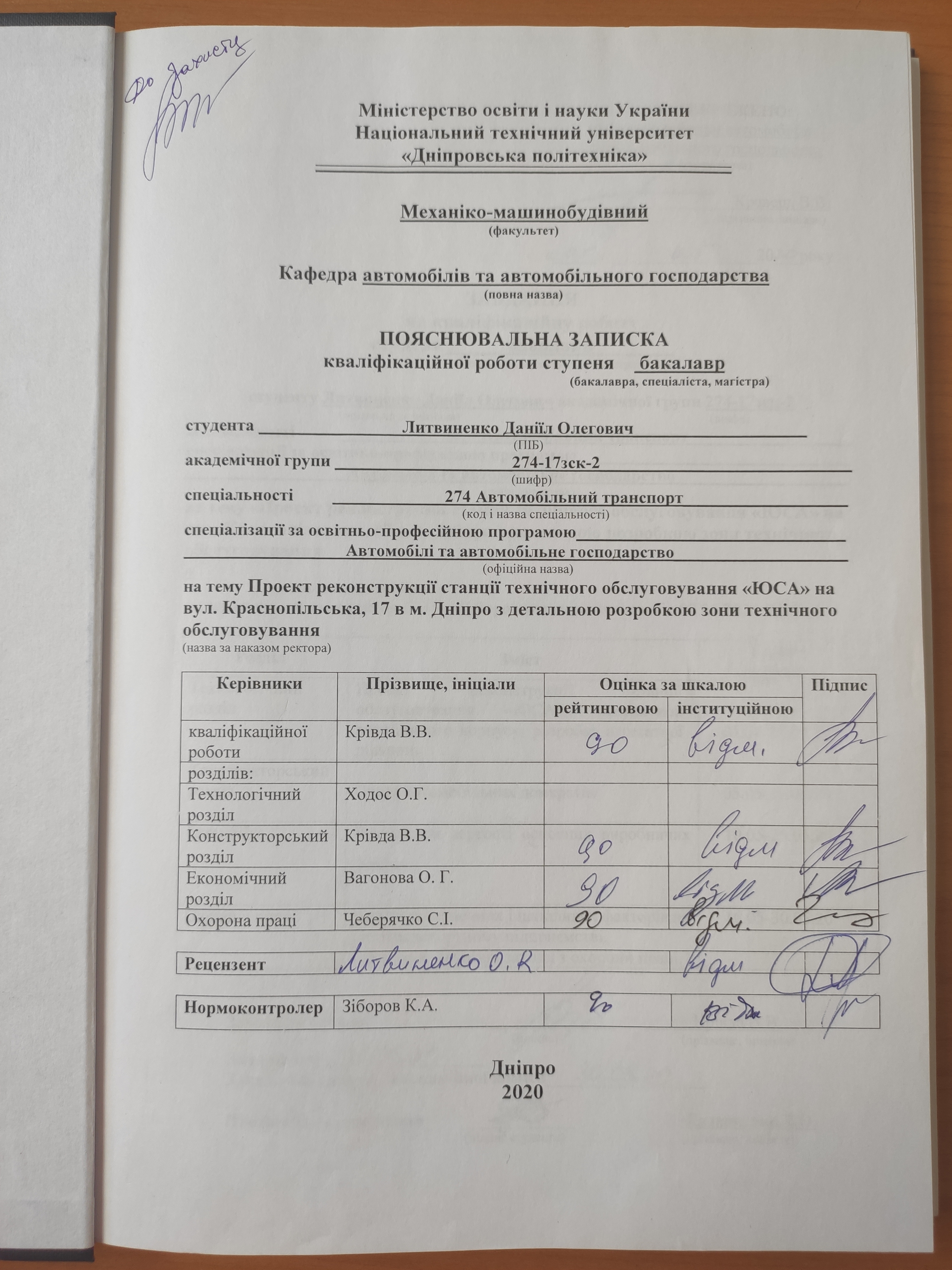 Проект реконструкції станції технічного обслуговування «ЮСА» на вул. Краснопільська, 17 в м. Дніпро з детальною розробкою зони технічного обслуговування