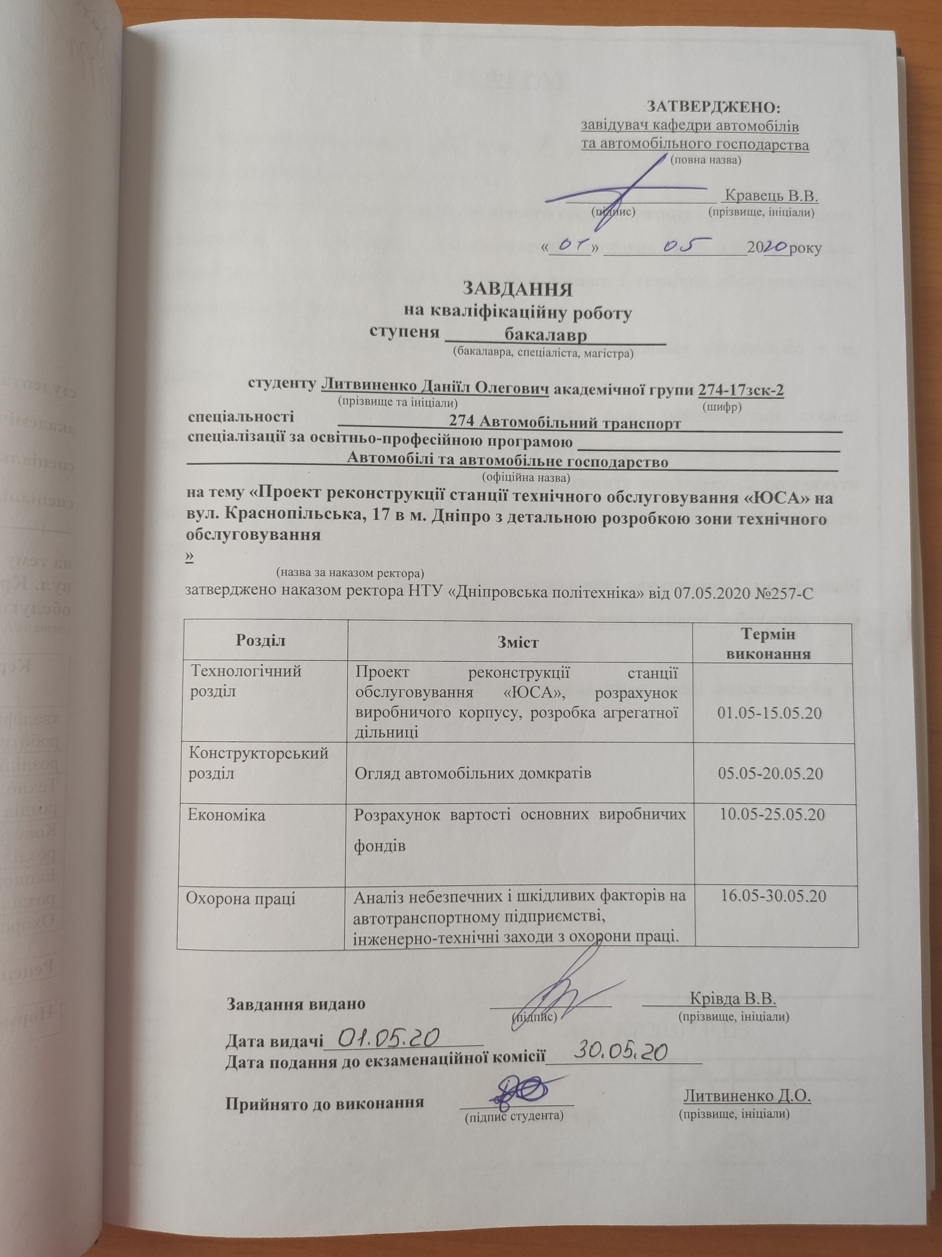 5. Проект реконструкції станції технічного обслуговування «ЮСА» на вул. Краснопільська, 17 в м. Дніпро з детальною розробкою зони технічного обслуговування